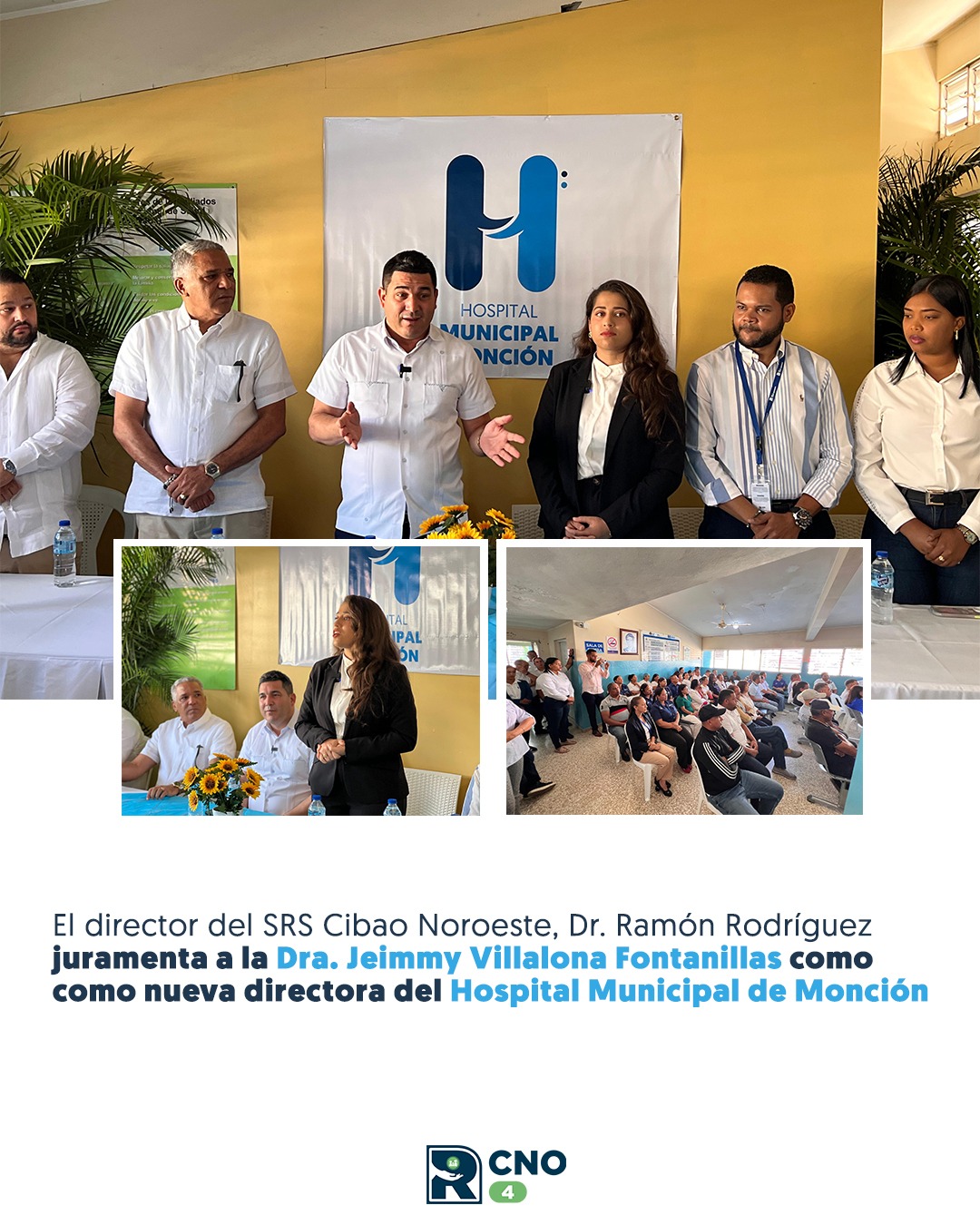 El Dr. Ramón Rodríguez, director del Servicio Regional de Salud Cibao Noroeste (SRSCNOR4), juramentó este lunes a la Dra. Jeimmy Villalona Fontanillas como nueva directora del Hospital Municipal de Monción, en un acto que reafirma el compromiso de las autoridades de salud con el fortalecimiento del sistema sanitario en la región.